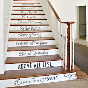 Amazon Com A Count Every Journey Stairs Quote Wall Decal Sticker Decor Room Art Vinyl Peace Family Home House Staircase Home Kitchen from images-na.ssl-images-amazon.com Includes a stunning staircase carpeted in brown polkadots that tie in the brown spiral design of the nearby area rug. If the complete order is available at the selected pickup store, customers can pick it up for free the same day, if the order was placed by 2:00pm (local store time). See more ideas about stairs, home, staircase. But if you're running out of room to spread cheer, we suggest you take your holiday decor to new heights—starting with your stairs. 31 stair decor ideas to make your hallway look amazing. Outdoor wall décor home décor furniture rugs. Tour their nyc store to see why Another job completed by rev decor some tlc needed on this one another happy customer.